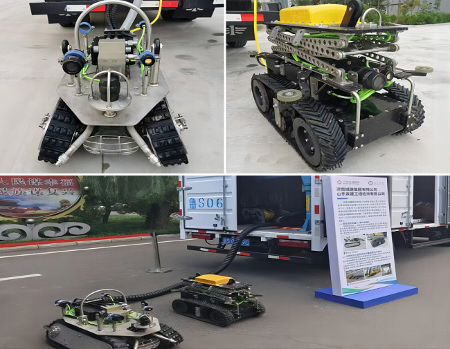 集團創新研發的管道清淤機器人、管道雷達檢測機器人兩款智能建造高新裝備均達到IP68等級,可在管道滿水情況下作業。其中,管道清淤機器人對管道內淤堵采用聲吶定位,前端搭載高壓噴頭及吸污口,實現DN800及以上管徑管道的快速高效清淤;管道雷達檢測機器人搭載高性能防水雷達天線,并設有升降裝置,可根據不同管徑,靈活調整雷達高度,實現DN800及以上管徑管道內表面及壁后缺陷的精準檢測。