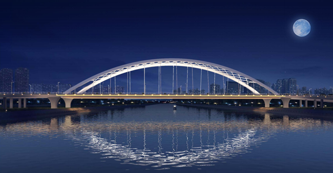 集團承建的二里橋路跨京杭運河節點工程(曲江大橋)項目連續上跨濱河西路、京杭運河、東外灘路(規劃),主橋采用“鋼箱提籃拱”結構,由拱肋和交織的橫撐組成,相依相靠,形成穩定結構。設計靈感源自揚州“月亮城”的文化意象。側觀橋體,兩向內收攏的拱肋形如彎月,網狀橫撐交織成輕盈的弧線;夜間燈光亮起時,橋影與水中明月相映成趣,恰似“二分明月落長河”的詩意畫卷。橋型勾勒出了古樸靜謐的揚州,穿越千年,風姿如故,它宜清風、宜月色,人與自然相互包容,與揚州打造“文化旅游名城、生態宜居名城” 的規劃相得益彰。