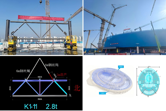 本次首吊的鋼桁架位于屋蓋起始安裝區(qū)域,單榀重量2.8噸。面對屋蓋結(jié)構(gòu)面積大、體量大、跨度大,構(gòu)件節(jié)點三維坐標精確定位難等挑戰(zhàn),集團建設(shè)團隊創(chuàng)新采用“地面拼裝、整榀吊裝”方案,多臺大型起重機械協(xié)同作業(yè)。同時,通過強化計算分析、嚴控拼裝精度、精準測量定位、嚴把焊接質(zhì)量,確保吊裝安全與施工質(zhì)量雙可控,助力實現(xiàn)首吊圓滿成功。
