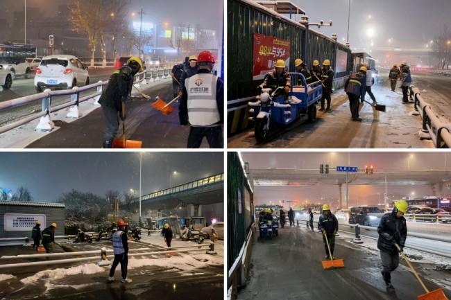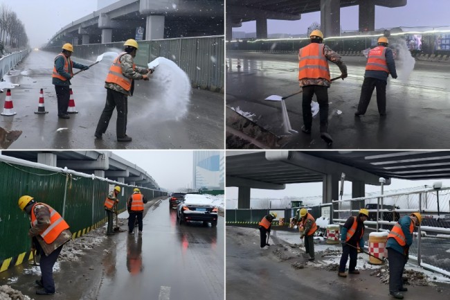 城建六公司黃崗路穿黃隧道項目部及人行天橋項目部針對309國道輔路、幸福寺路等處的積雪結冰情況,迅速部署,立即組織工人開展掃雪除冰作業。黨員干部和青年職工帶頭,分工協作,高效清除通行隱患,保障路段通暢,以快速響應和務實行動守護群眾平安,展現了國企為民服務的責任與使命。